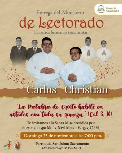 El Seminario Mayor «Mater Misericordiae», se alegra por los seminaristas CARLOS ACUÑA ALARCÓN y CHRISTIAN AYALA MENDOZA, que serán instituidos en el ministerio del Lectorado, en su camino de configuración con Jesucristo Buen Pastor.